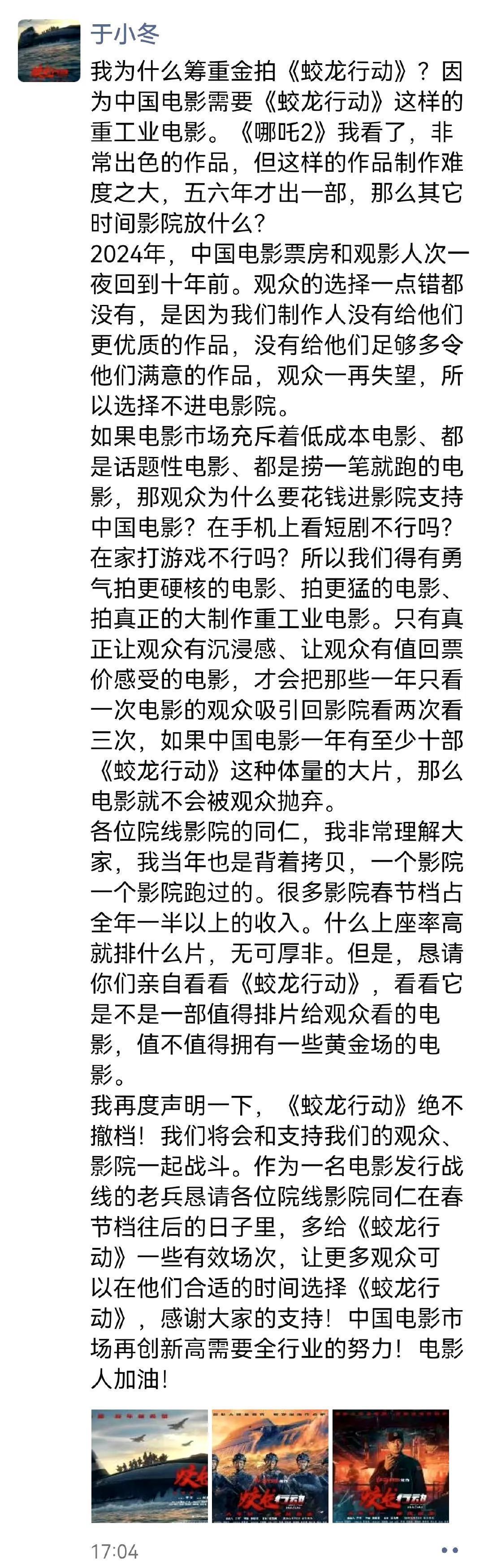 眼看《蛟龙行动》回本无望,于冬一再发文,言语中却不减自负。