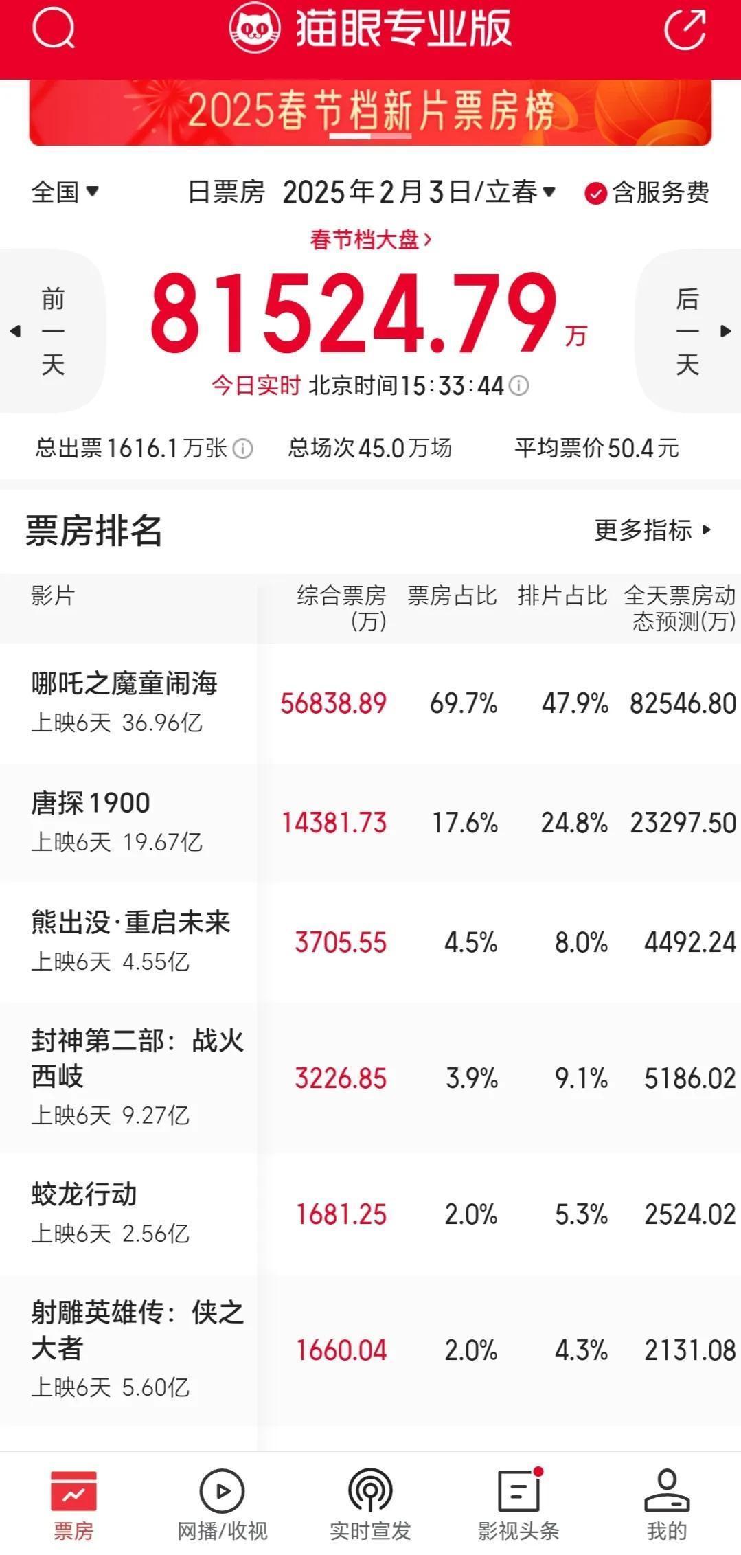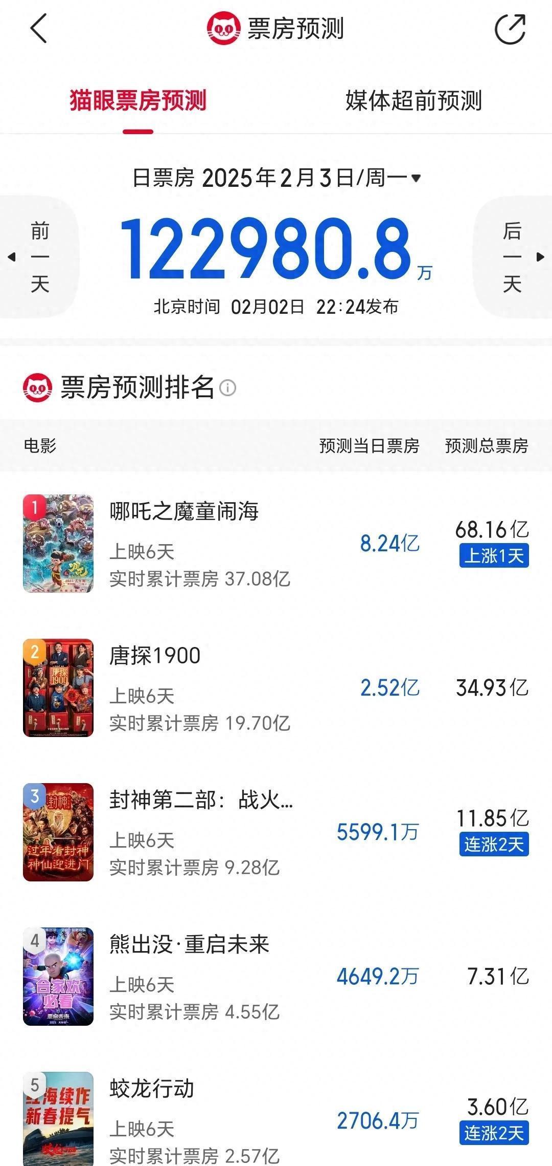 《唐探1900》稳居亚军宝座,《射雕》口碑不佳票房尚可,《封神2》票房已接近10亿,《熊出没》有小朋友们护航,只有《蛟龙行动》破防了。