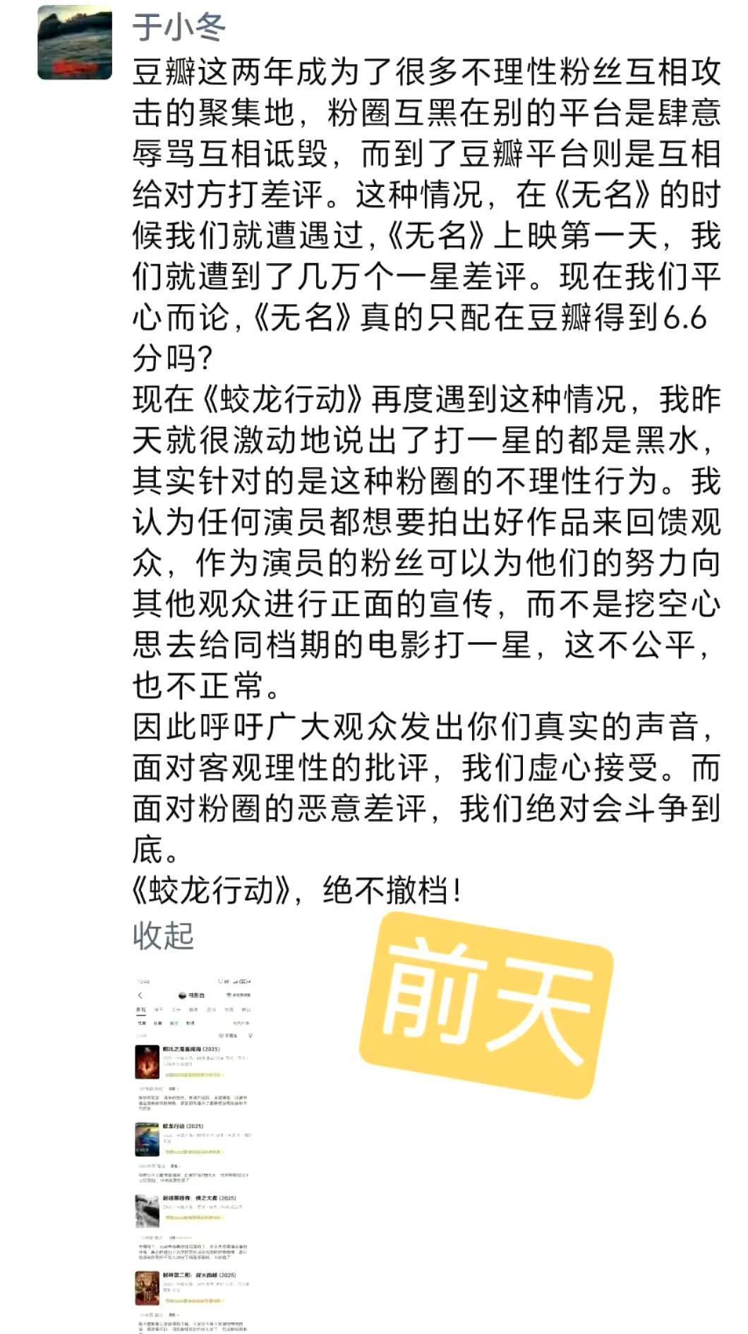 作为博纳影业的CEO,于冬多次公开发文质疑《蛟龙行动》的票房和口碑表现,效果其实适得其反。